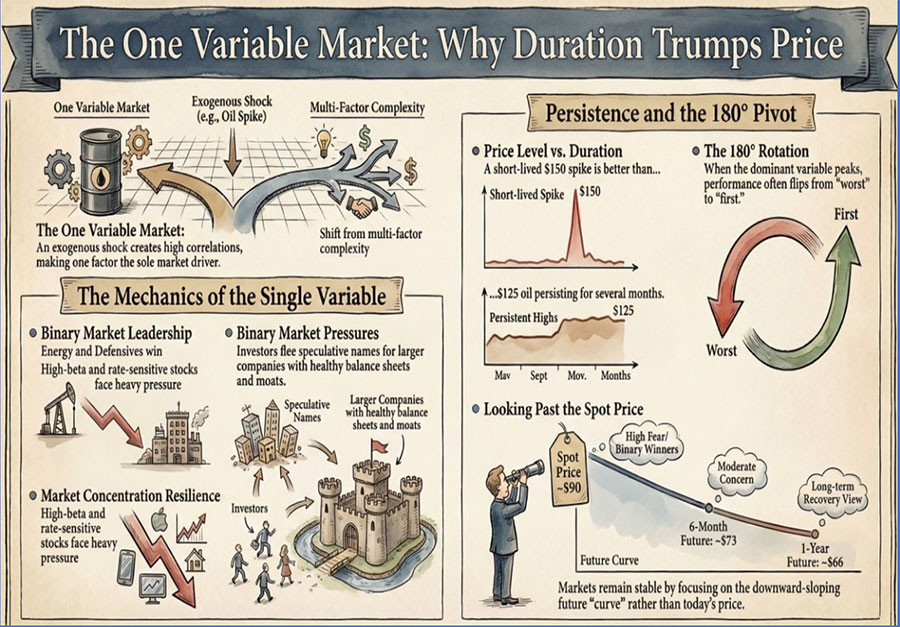 Managing risk in the current environment is uniquely challenging because traditional frameworks—like valuation, sentiment, and economic fundamentals—have taken a backseat to a single dominant variable: the price of oil. In this “One Variable Market,” an exogenous shock creates high correlations, making energy the primary driver of both risk and leadership.