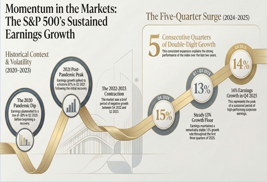 Despite recent geopolitical headwinds, the S&P 500 has demonstrated remarkable resilience, officially recording five consecutive quarters of double-digit earnings growth as of Q4 2025.